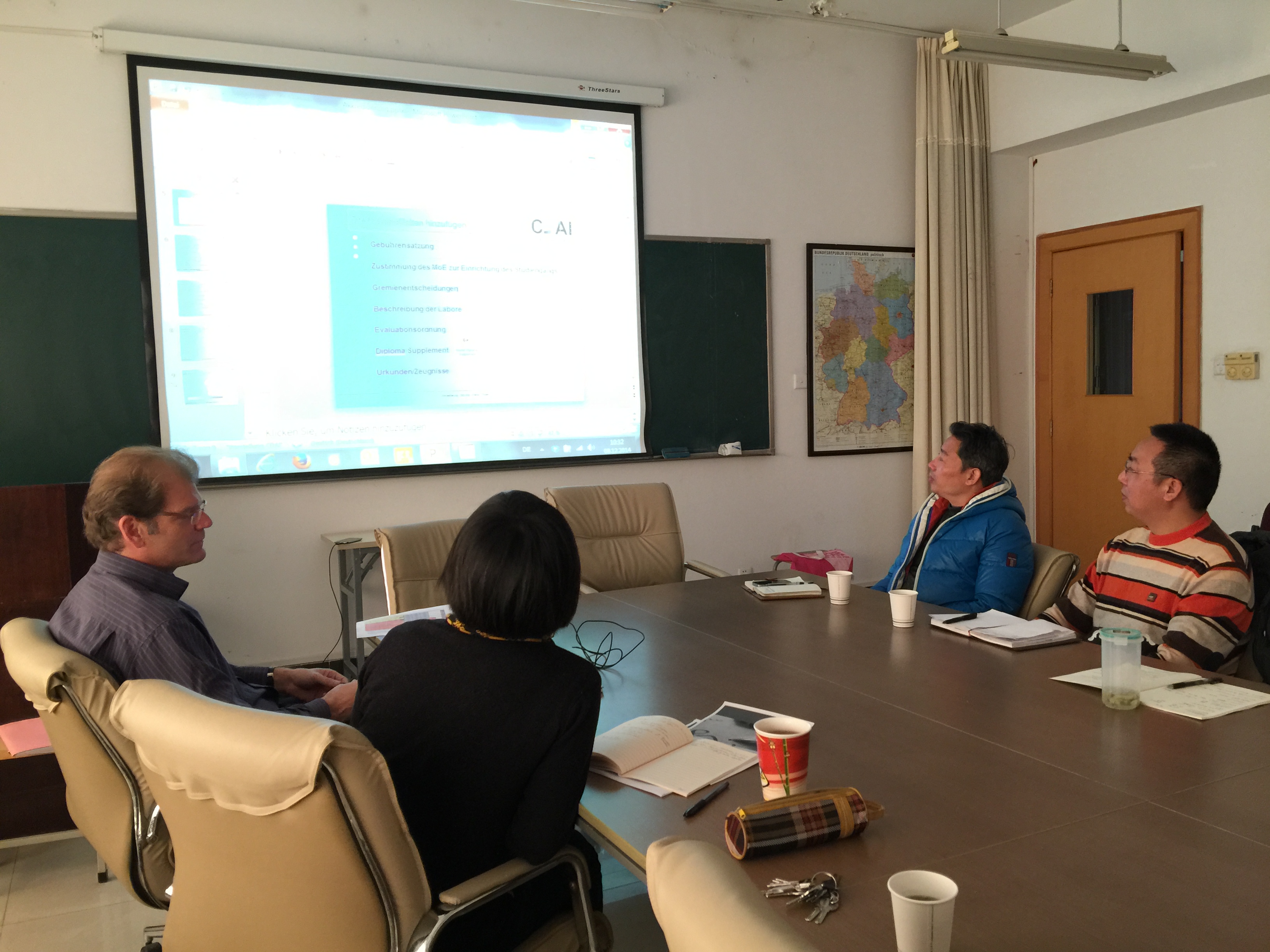 与会人员包括了黑料网 夏院长、德方院长Oldsen先生以及学院专业老师等。会议主要就专业认证的目的、认证的过程以及认证需要提供的材料三方面展开了讨论。