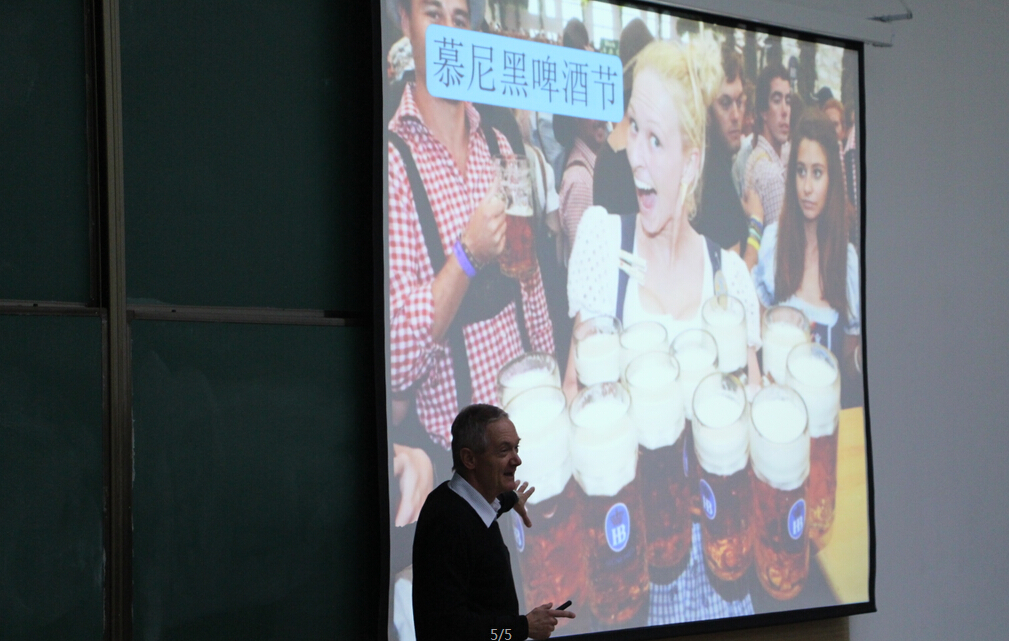 两位教授在讲座中着重为新同学们介绍了德国的大学校园,如何在德国大学中学习以及教授们各自的研究领域。颇为精彩的环节便是对德国文化的介绍,引起了同学们极大的兴趣。两位教授从德国历史谈到饮食文化,比如慕尼黑啤酒节,再谈到欧洲的一些重要城市等等。