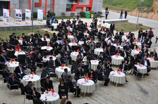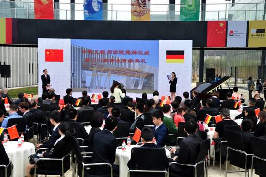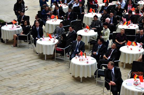 会场设在户外,布置简洁雅致,点点滴滴尽显中德文化的交融。简单大方的小舞台以中德两国的国旗、三所合作院校的校标为背景,散布会场的香槟色小圆桌缀以鲜艳的中德小桌旗,浙江科技学院中德合作三十年成果展也陈列在会场,向全校师生开放展出。全体师生正装出席,中德双语交替传译,背景音乐现场钢琴演奏,大家沉浸在庄重典雅的气氛之中。