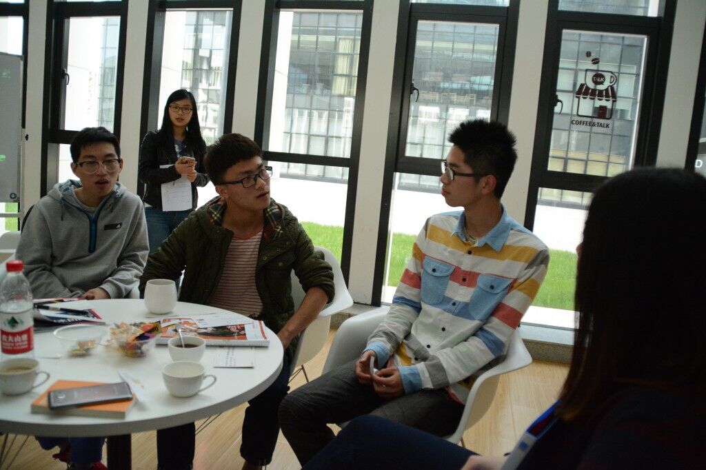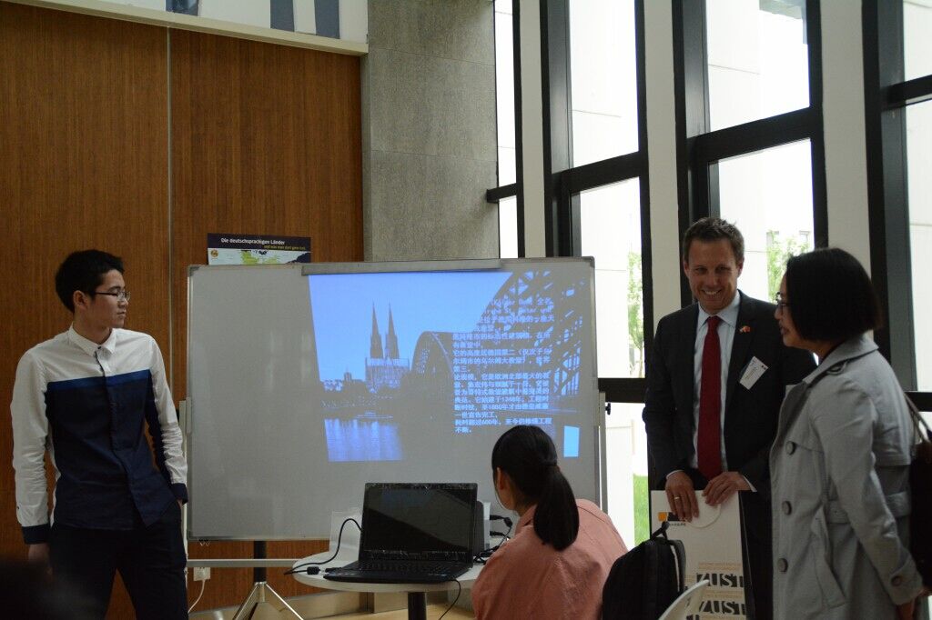 图为德国石荷洲代表团参观I-cubic咖啡吧,与同学们共赏德国人文风景