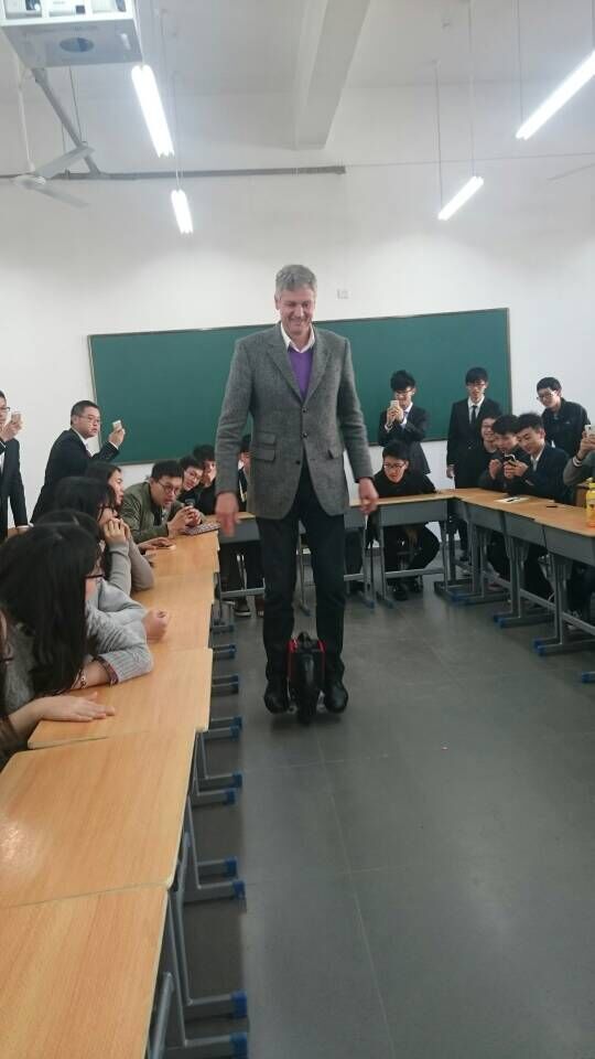 Schall教授还拿出了自己的宝贝:代步车,这是他从浙江科技学院的一个学生手中买得的,十分喜欢,甚至随身携带到了这里。兴之所至,他为大家展示了怎么使用代步车,赢得同学们的阵阵喝彩。