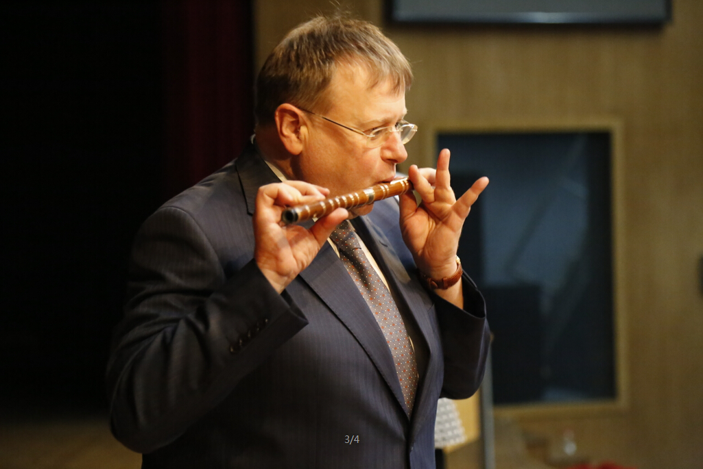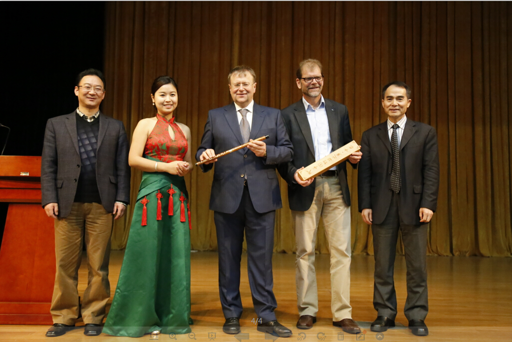 叶校长、夏院长也来到了现场。来自艺术中心的陈静老师此时上台,为大家表演了优美的笛子曲《扬鞭催马运粮忙》和《梅花三弄》。表演结束后,叶校长向Kirsch教授和德方教学院长Oldsen先生赠送了精美的笛子。Kirsch教授还在现场吹响了笛子,赢得大家一阵阵的掌声。