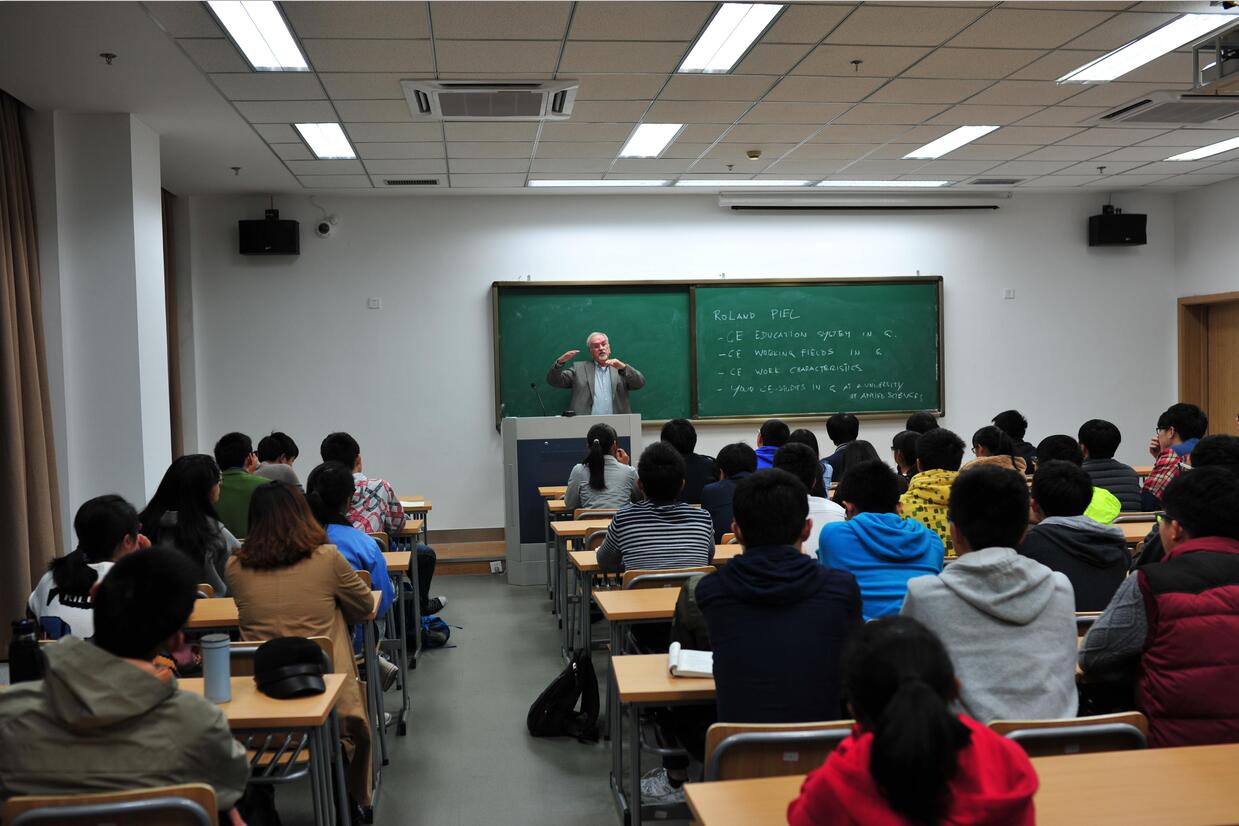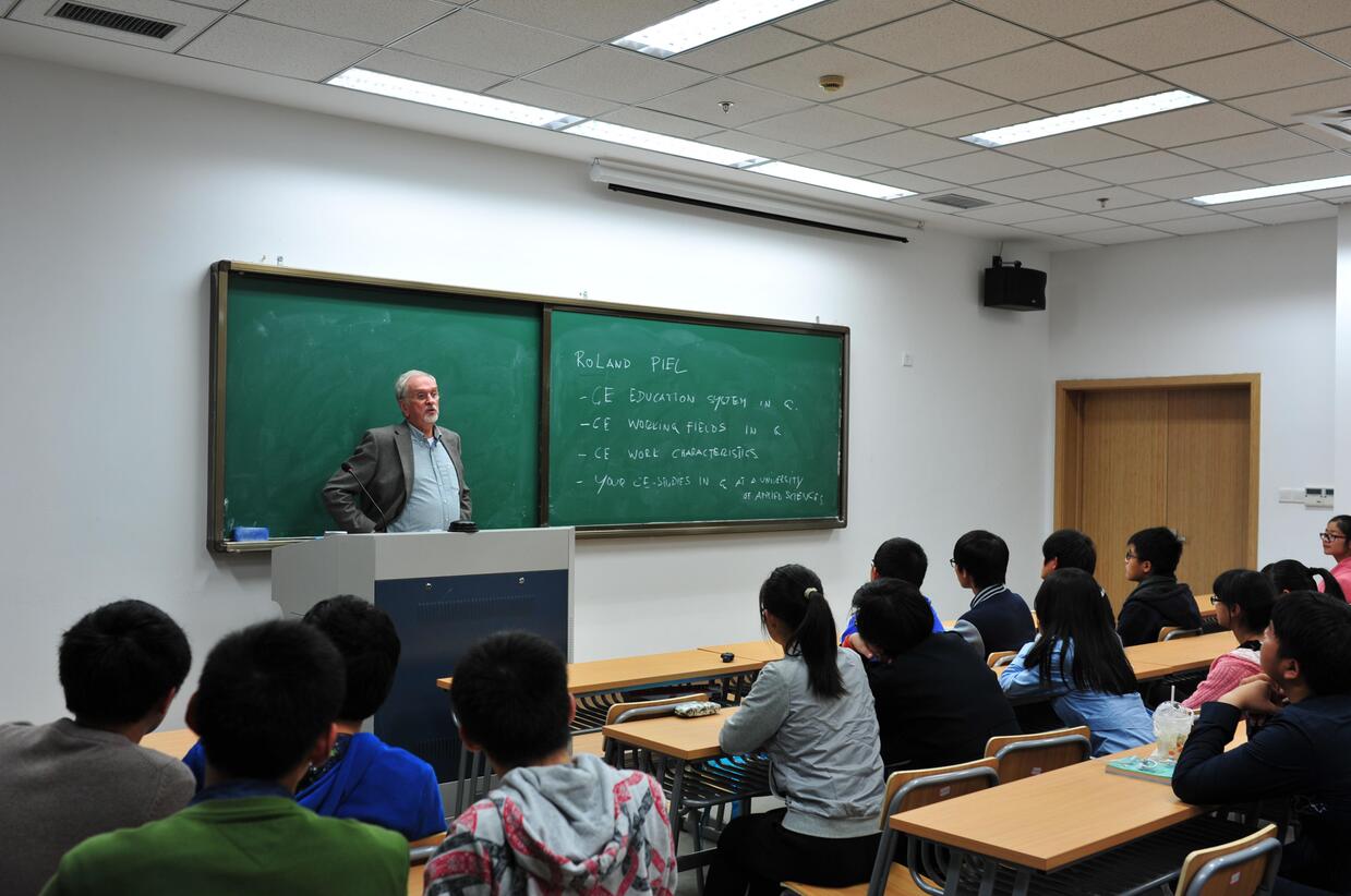 Piel先生主要和我们讨论了四大主题:德国教育系统、土木专业的工作领域、土木专业的工作特点和未来就业所需条件。通过简短的自我介绍,我们得知Piel教授在大学工作前有过相当丰富的实践经验。在德国,新生都会在大一接到任务,经过3年的磨砺,学生们逐步成长,学会了把理论与实践相结合,由最初的磕磕绊绊,到后来的游刃有余,最终成为社会所需要的人才。在这化茧成蝶的过程中,教授们不会教学生们“HOW TO DO”,他们只会“SHOW WHAT TO DO”,因为,只有“FIND THE WAY BY URSELVES”,才可以学到更多书本上学不到的知识!Piel教授鼓励我们利用暑假多实践,多思考。在土木行业里遵循规程,做一名合格的土木工程师。这次会面在学生们的精彩提问和Piel教授的机智回答中愉快地结束了。