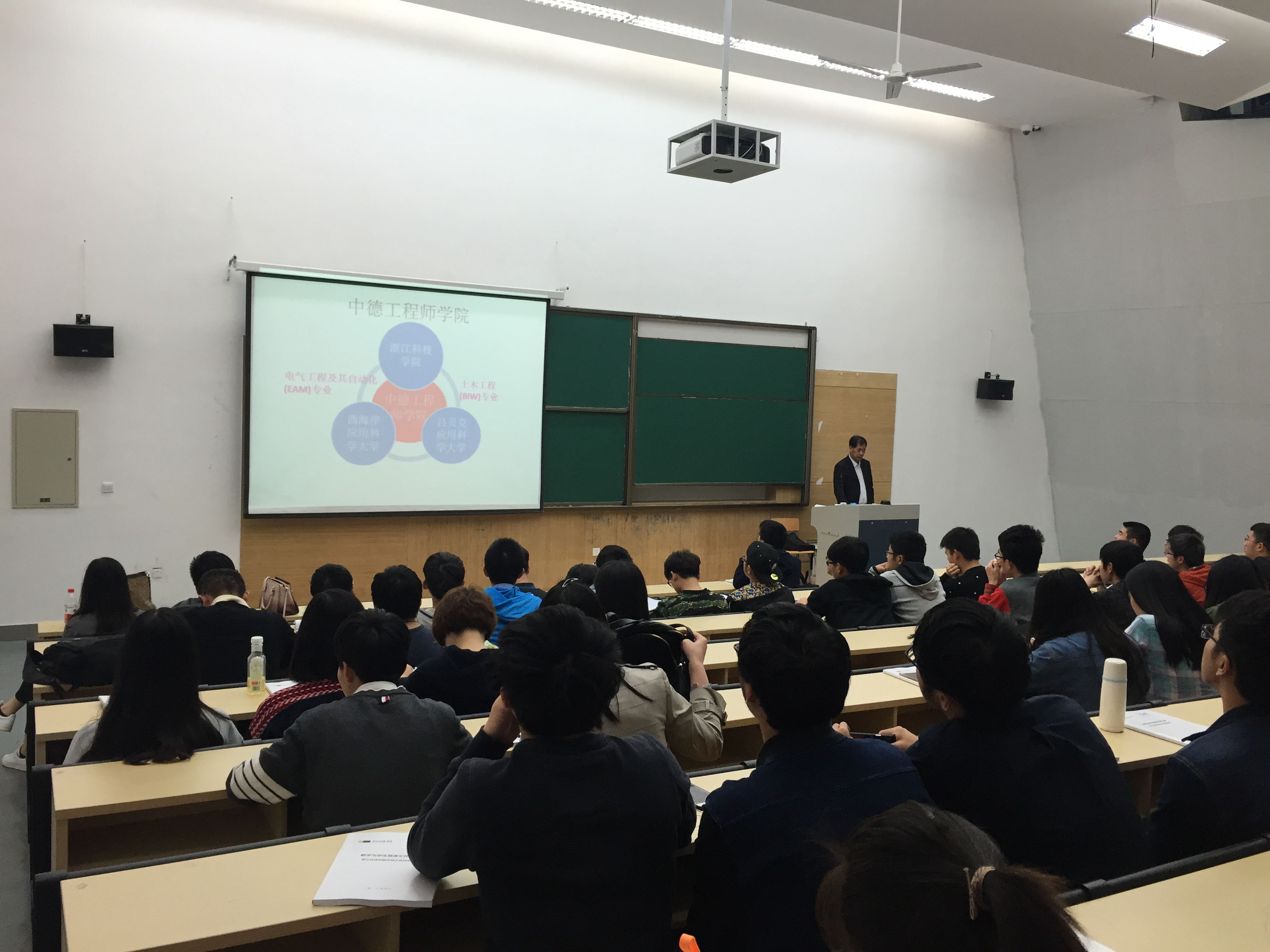 徐理勤院长详细介绍了预实习、实习项目的条例和出国选拔的程序,并着重强调了获得中德双方学士学位的注意事项。在介绍交流奖学金时,徐院长鼓励同学们积极参与暑期赴德交流夏令营活动,开拓眼界,学习专业知识,为今后的学习工作打下坚实基础。