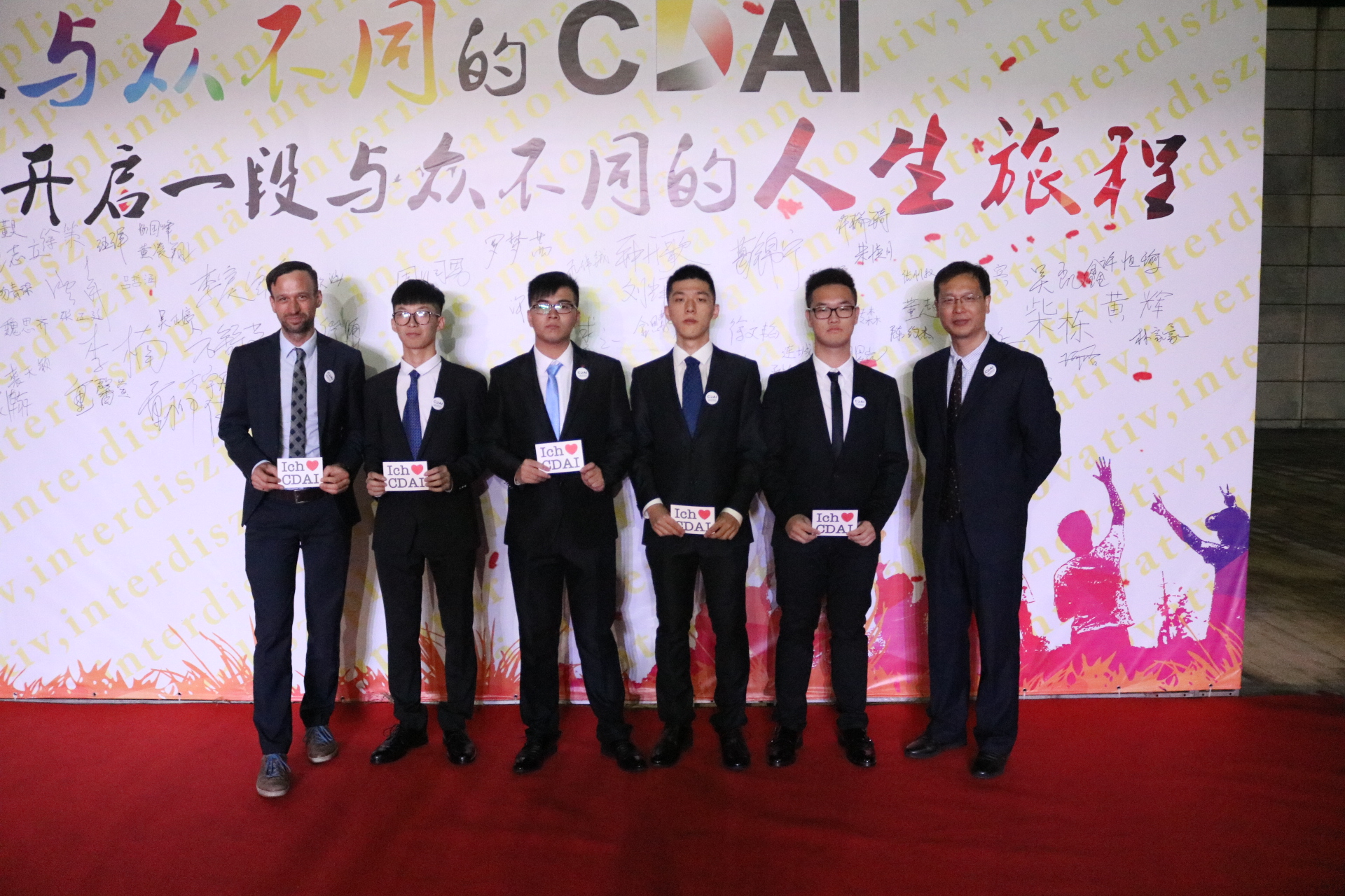 16级新生于晚17:30陆续走上红毯,由黑料网 院长、教学院长及专业负责人分别授予院徽和“我爱CDAI”的明信片,新生们还在题有“加入与众不同的CDAI,开启一段与众不同的人生旅程”的签名墙上签字并合影留念。同时,学院还为新生们准备了内容丰富的各类展览,使新生们加强对学校中德合作历史、学院发展历程的了解。学院机器人团队的展示也引发了新生们浓烈的兴趣。