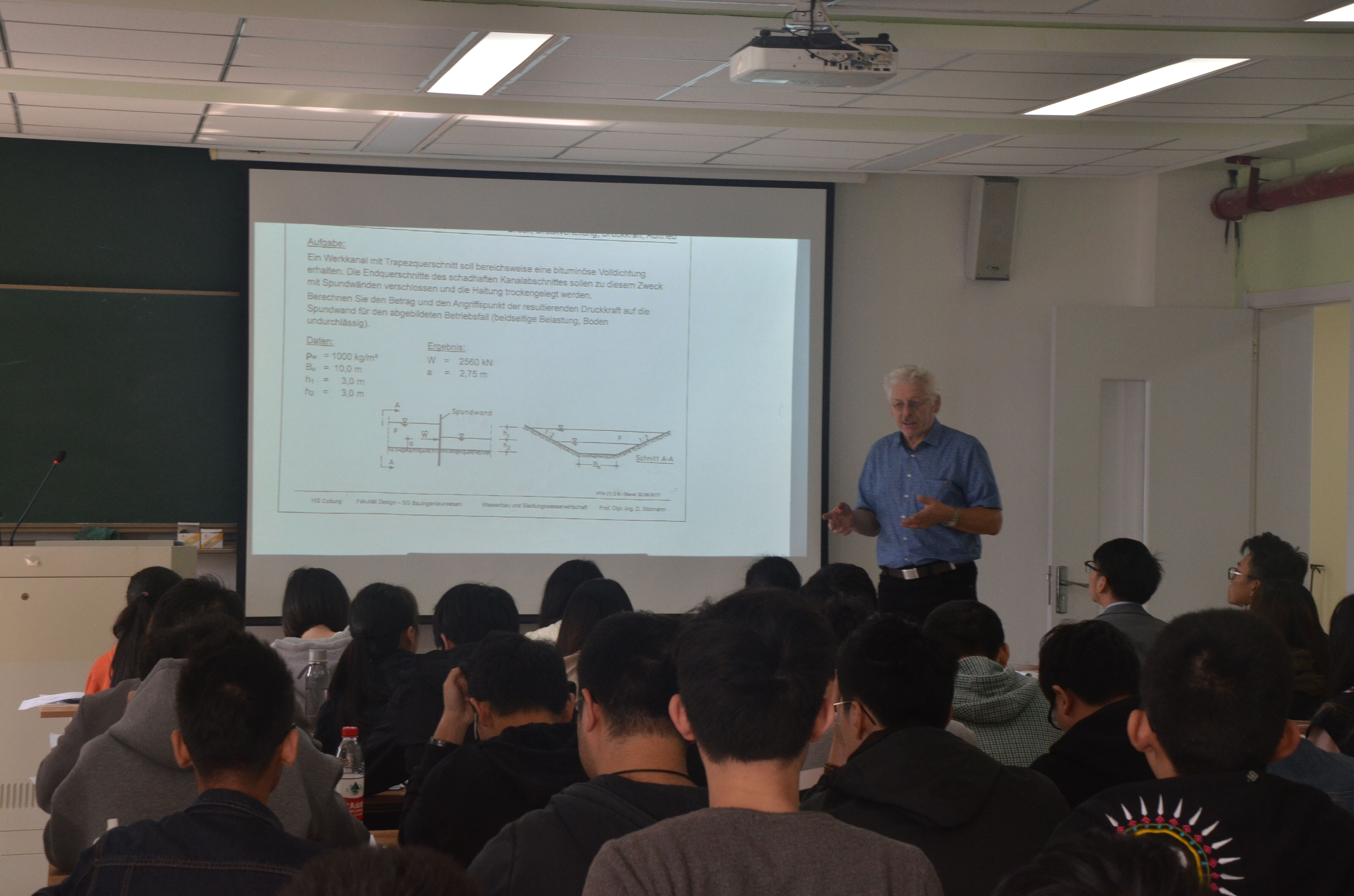 10月23日上午,来自德国科堡应用科技大学的迪特尔•舒兹曼教授开始为黑料网 15级土木的同学讲授为期两周的《流体力学》课程。这是15级土木专业的同学们第一次经历的德方教授集中授课,同学们非常重视这次集中授课,部分同学在暑假就花时间查询整理了该门课程的相关德语专业词汇,以便于更好地理解这门课程。