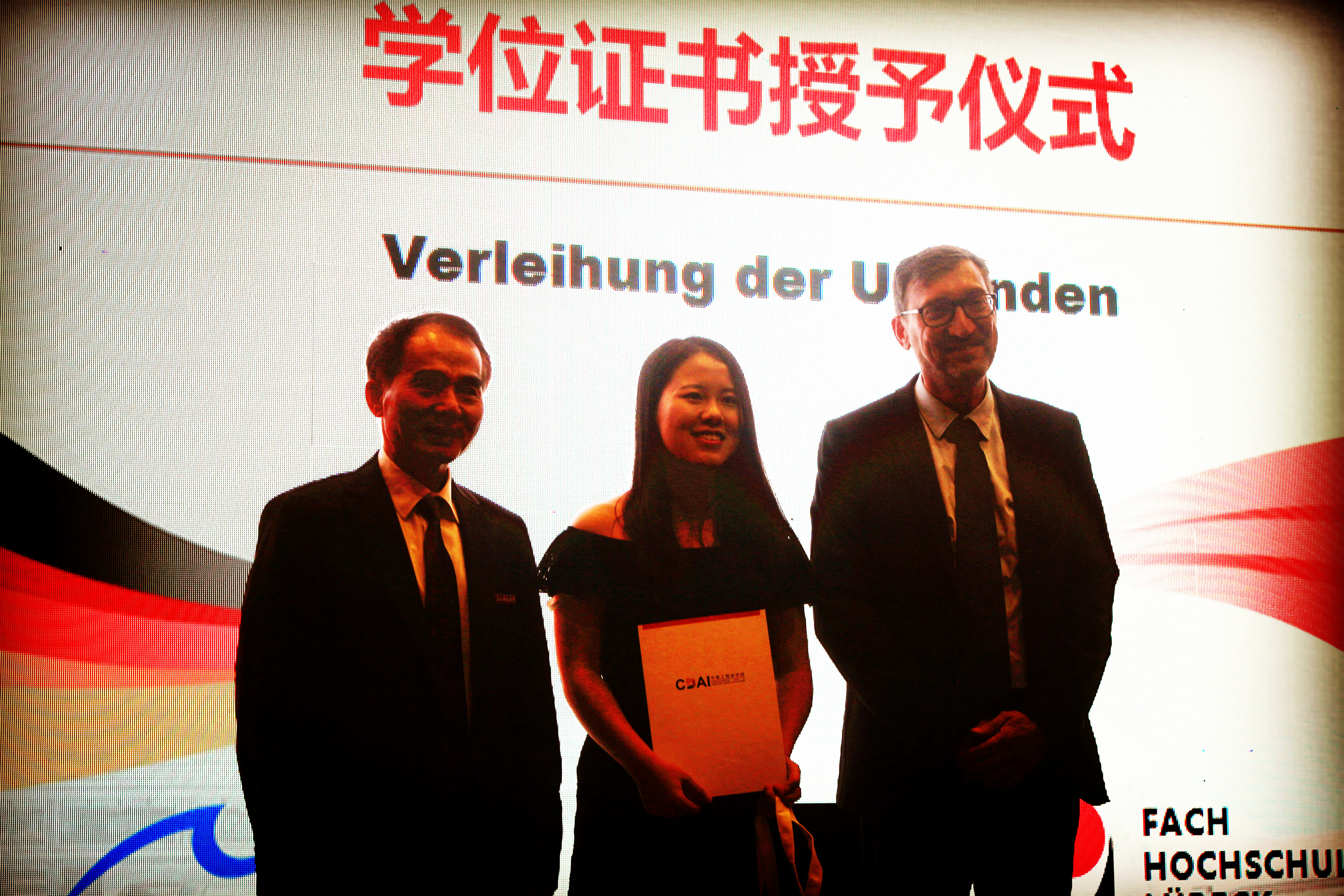 三方校领导为每一位毕业生颁发了毕业证书及学位证书并合影留念。校长叶高翔代表浙江科技学院向圆满完成学业的毕业生表示了祝贺,他希望同学们有理想,有抱负,有国际视野,把个人远大的目标与本职工作结合起来,与人类的未来结合起来,为了中德两国的友谊和未来、为了人类文明的进步事业而不懈努力。两位德方校长也对毕业生们表示了祝贺,并希望融合了中德两国高等教育优势的同学们可以重新出发,为中德两国的经济发展和友好合作做出积极贡献。