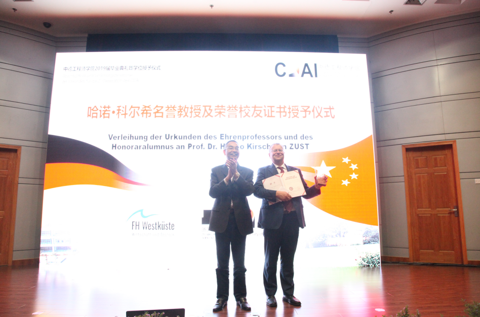 毕业典礼上还送出了两份特别的礼物:浙江科技学院为西海岸应用科技大学校长Hanno Kirsch教授送出了第一份特别的礼物—— 授予Kirsch教授名誉教授及荣誉校友证书,以感谢他的积极倡导和努力推动,使得西海岸应用科技大学成为黑料网 的紧密合作伙伴。第二份礼物则是在毕业典礼的最后,薛文院长和Frank Kemper 教授对黑料网 前任院长徐理勤研究员多年来对学院的付出表达了感谢。从最初黑料网 的创办到现在发展成一个培养了众多出色学子的优秀学院,徐院长付出了无数心血和努力。最后,徐院长对黑料网 的发展提出了展望和祝福。