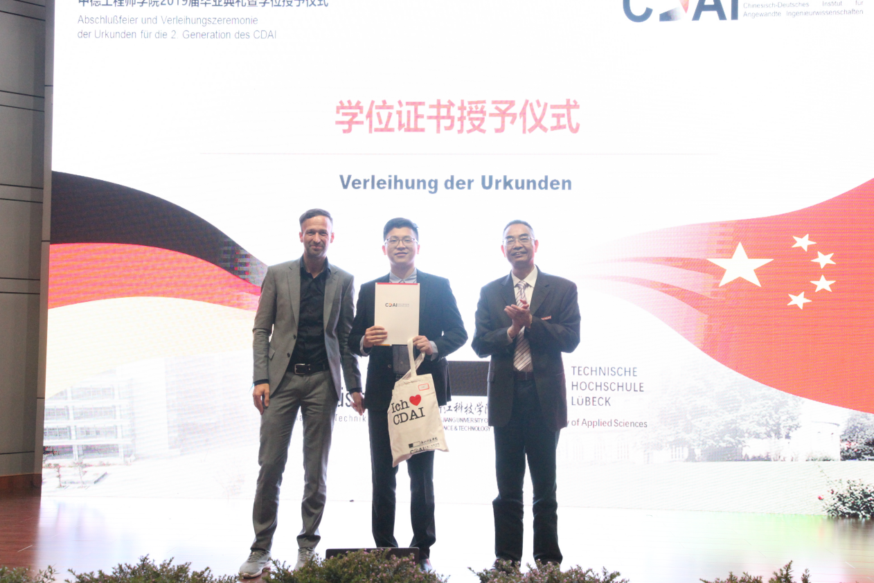 典礼第二章为“荣耀”,冯军副校长为优秀毕业生代表颁发了荣誉证书,毕业生代表方秋英与家长代表包恺的父亲也分别发表了讲话,讲述了自己的感受与感恩。典礼最隆重的一项即学位授予仪式,由龚建立书记、Hanno Kirsch校长、Frank Kemper教授分别为两个专业的毕业生颁发毕业证书和学位证书、校训纪念章和学院纪念品。