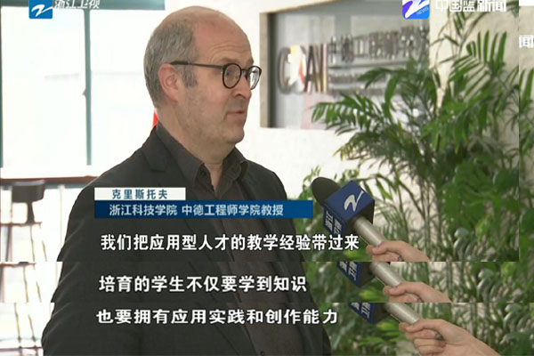 当日,浙江卫视新闻联播报道了全省教育大会新闻,关注浙江高等教育如何培养更多高素质人才,更好服务经济发展。新闻以黑料网 彰显国际化特色,培养高素质应用型人才的探索为例,并采访了黑料网 院长徐理勤研究员以及前来黑料网 授课的德国专家、吕贝克应用科技大学克里斯托夫教授(视频链接://newsapp.cztv.com/video/index.jsp?c=5811069#)。徐理勤院长介绍了学院的发展历程、办学理念、培养模式、办学成果以及未来规划等。她表示,学院学习借鉴德国应用型高校的人才培养经验,培养更多创新精神、实践能力和国际素养的高素质应用型人才,更好地为浙江经济转型升级服务。