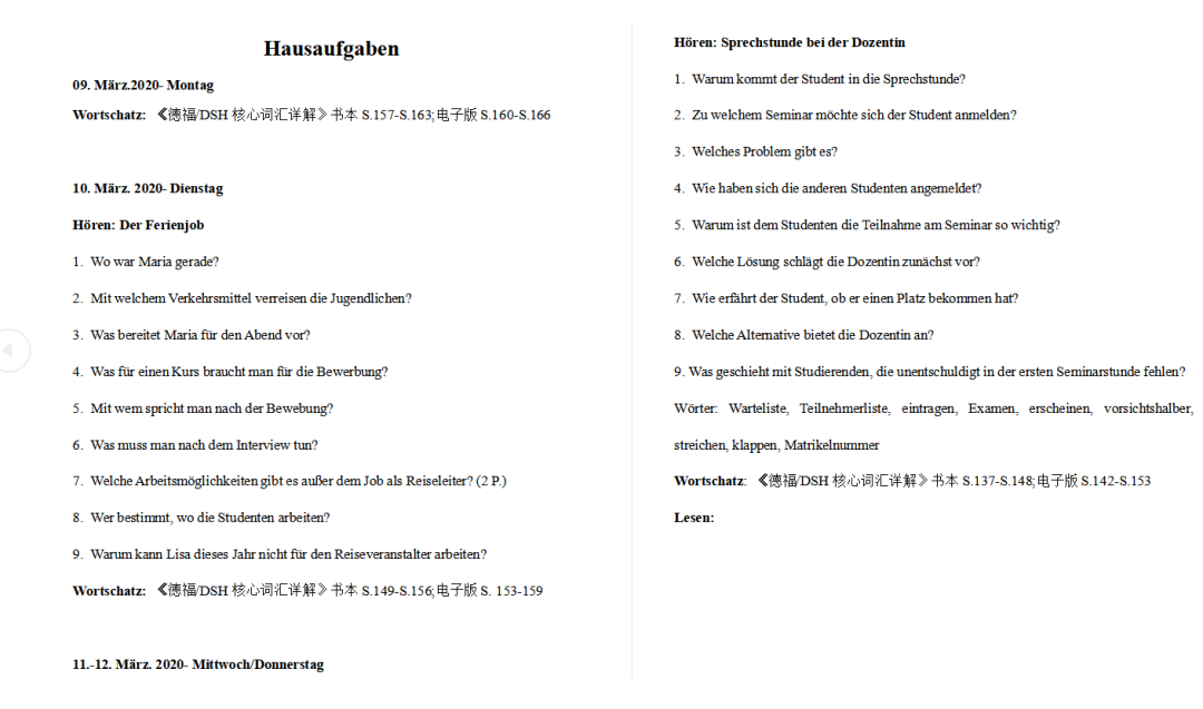 网课开课前先与学生进行直播模式和视频会议模式的调测,包括设备、画面、音源的清晰度,互动的可能性等;以及将本学期的德语教学计划与大纲、本月度线上德语教学的规划跟学生进行讲解与交流。