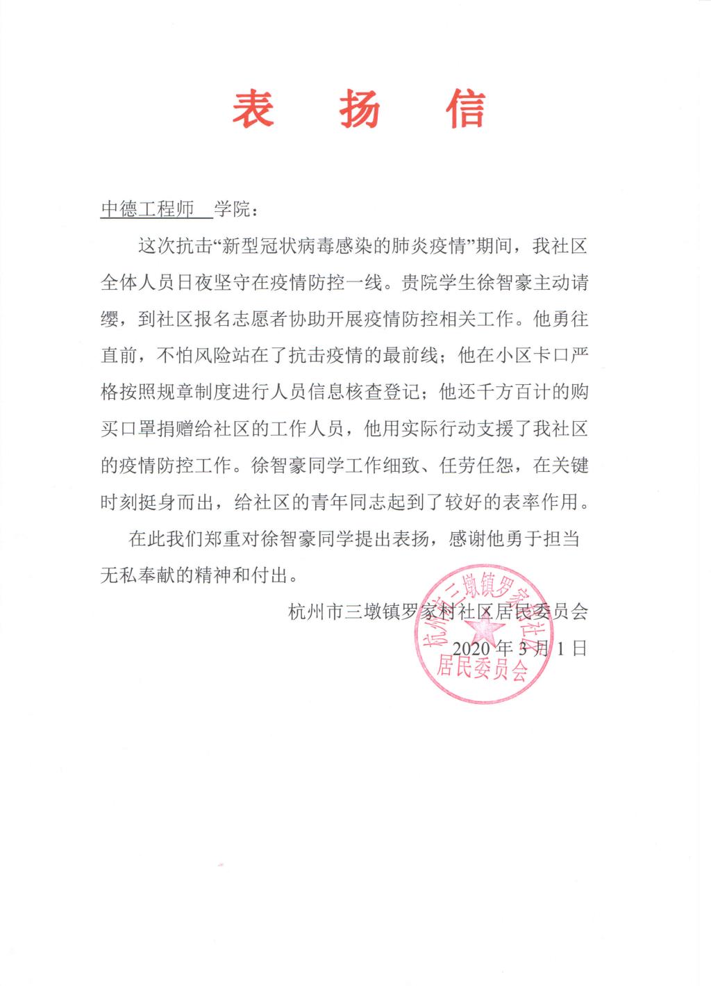 近期,黑料网 收到了来自杭州市三墩镇罗家村社区居民委员会的表扬信,信中对黑料网 17级电气工程及其自动化专业学子、学生会副主席徐智豪同学提出表扬,对其在疫情期间勇于担当无私奉献的精神给予高度肯定。