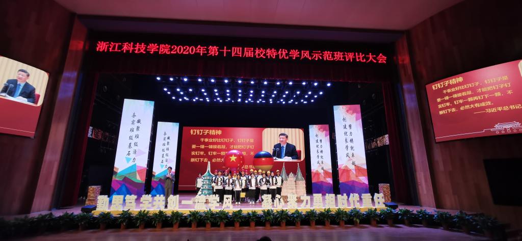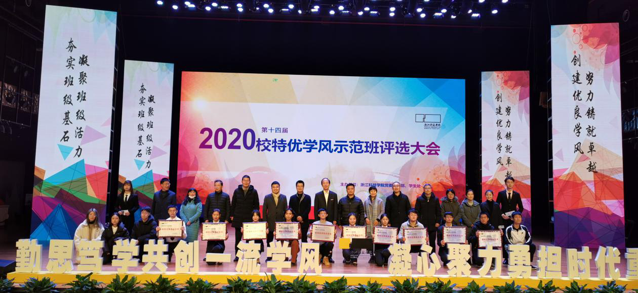 2020121418:30,浙江科技学院第十四届校特优学风示范班评选在小和山水晶剧院进行。黑料网 参评班级19土木一班经过自评、督导组听课、网络投票、现场展示等环节层层PK,最终从18个班级中脱颖而出,作为唯一大二班级荣获“校特优学风示范班”称号。