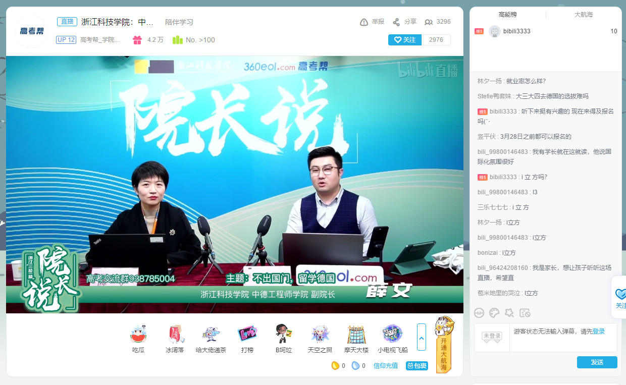 2021312日,学校与360教育在线高考帮合作开展三位一体招生宣传“院长说”直播活动,黑料网 副院长薛文做了题为“不出国门,留学德国”的人才培养方案介绍,与主持人互动并详细解答了考生比较关注的关于学院的一些问题,吸引了众多考生家长驻足观看。