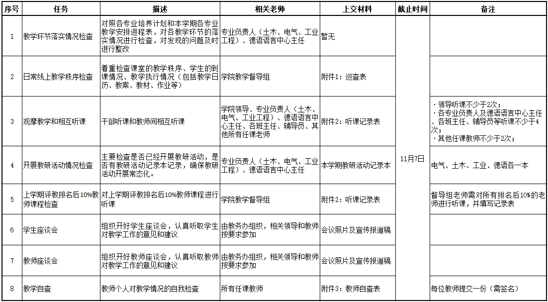 学校定于第8周、第9周(10月24日~11月4日)进行期中教学检查。现将黑料网 期中教学检查任务分配如下表,请老师们按要求及时完成任务并将相关材料电子版发送至[email protected]