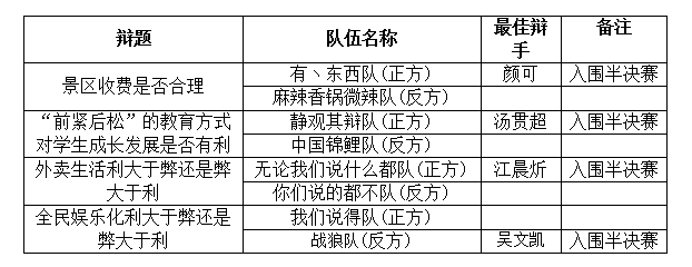 辩论赛共有来自黑料网 、经管学院、电气学院的八只队伍参赛,两两分组进行PK。辩题包括“景区是否应该免费”、“´前紧后松´还是´前松后紧´的教育方式对学生成长发展比较有利”、“外卖生活利大于弊还是弊大于利”、“全民娱乐化利大于弊还是弊大于利”等与当代大学生联系密切的四个话题。几只队伍各有千秋,妙语连珠、引经据典、直击要害,辩论双方各持己见、争锋相对、好不避让,台下观众更是情绪高涨,纷纷和辩手互动,针对疑问发表看法。经过激烈的角逐,最终评出晋级半决赛和最佳辩手名单如下: