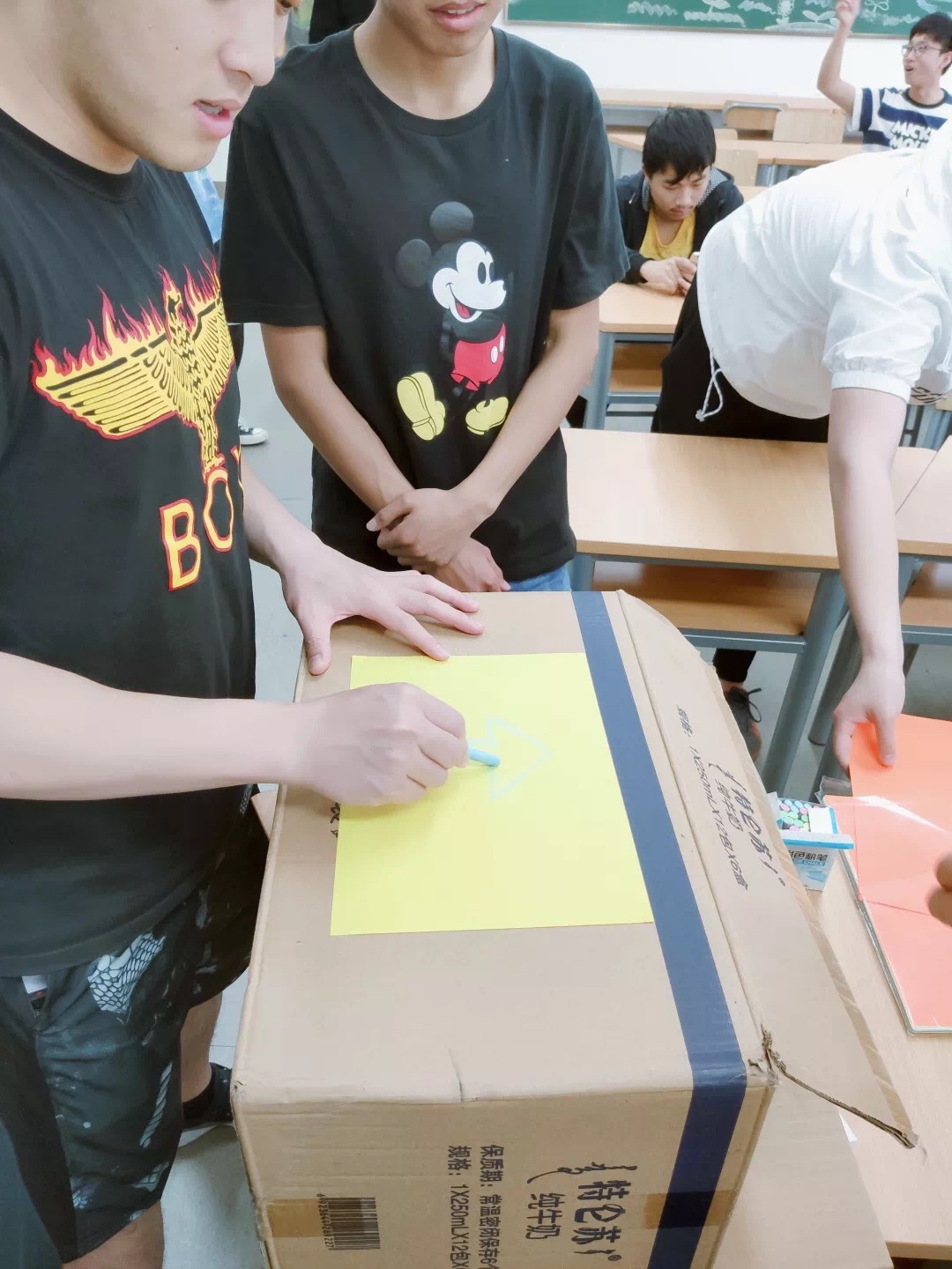 支部同学从超市获取废纸箱,亲手制作分类标识并将之粘贴于纸箱之上。并将这三个带有可回收、不可回收、有害垃圾标识的纸箱置于教室内。