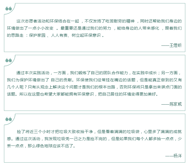 顶着强烈紫外线,经过两个多小时的劳动后,看着十几个满满的打包的垃圾袋,大家心里感慨万千。