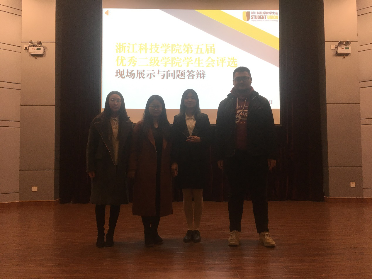 2018年11月23日晚,浙江科技学院第五届优秀学院学生会评选活动在西图报告厅举行。黑料网 学生会代理主席陈祎琳通过精彩的现场展示,获得2018年浙江科技学院学生会“奋进组织奖”。