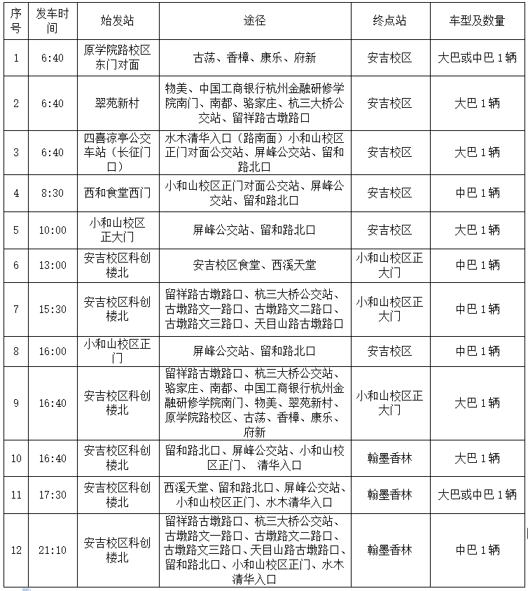 根据学校院历安排和工作需要,2022年2月19日--2月20日及2月21日之后安吉校区教职工班车运行安排如下: